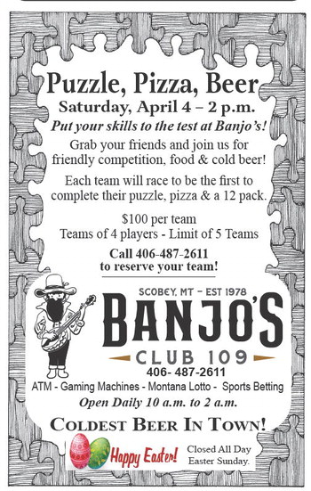 Puzzle, Pizza, Beer Saturday, April 4 – 2 p.m. Put your skills to the test at Banjo’s! Grab your friends and join us for friendly competition, food & cold beer! Each team will race to be the first to complete their puzzle, pizza & a 12 pack. $100 per team Teams of 4 players - Limit of 5 Teams Call 406-487-2611 to reserve your team! 406- 487-2611 ATM - Gaming Machines - Montana Lotto - Sports Betting Open Daily 10 a.m. to 2 a.m. Coldest Beer In t own! Closed All Day Easter Sunday. Puzzle, Pizza, Beer Saturday, April 4 – 2 p.m. Put your skills to the test at Banjo’s! Grab your friends and join us for friendly competition, food & cold beer! Each team will race to be the first to complete their puzzle, pizza & a 12 pack. $100 per team Teams of 4 players - Limit of 5 Teams Call 406-487-2611 to reserve your team! 406- 487-2611 ATM - Gaming Machines - Montana Lotto - Sports Betting Open Daily 10 a.m. to 2 a.m. Coldest Beer In t own! Closed All Day Easter Sunday.
