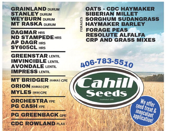 News Posted on April 1, 2026 Posted on April 1, 2026 GRAINLAND DURUM STANLEY WEYBURN DURUM OATS - CDC HAYMAKER SIBERIAN MILLET SORGHUM SUDANGRASS HAYMAKER BARLEY DURUM MT RASKA DURUM FORAGES HRS FORAGE PEAS RESOLUTE ALFALFA CRP AND GRASS MIXES DAGMAR ND STAMPEDE AP DAGR SY605CL HRS HRS HRS GREENSTAR IMVINCIBLE LENTIL LENTIL 783- 5 510 LENTIL 406- AVONDALE IMPRESS LENTIL MT BRIDGER (KABULI) CPE ORION (KABULI) CPE MYLES (DESI) CPE ORCHESTRA PG CASH YPE YPE We offer seed treat & innoculant application! PG GREENBACK GPE CDC ROWLAND FLAX GRAINLAND DURUM STANLEY WEYBURN DURUM OATS - CDC HAYMAKER SIBERIAN MILLET SORGHUM SUDANGRASS HAYMAKER BARLEY DURUM MT RASKA DURUM FORAGES HRS FORAGE PEAS RESOLUTE ALFALFA CRP AND GRASS MIXES DAGMAR ND STAMPEDE AP DAGR SY605CL HRS HRS HRS GREENSTAR IMVINCIBLE LENTIL LENTIL 783- 5 510 LENTIL 406- AVONDALE IMPRESS LENTIL MT BRIDGER (KABULI) CPE ORION (KABULI) CPE MYLES (DESI) CPE ORCHESTRA PG CASH YPE YPE We offer seed treat & innoculant application! PG GREENBACK GPE CDC ROWLAND FLAX