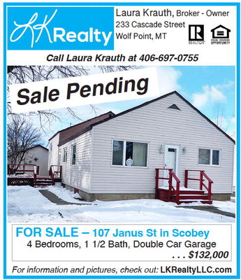 Laura Krauth, Broker - Owner 233 Cascade Street Wolf Point, MT Call Laura Krauth at 406-697-0755 SalePending FOR SALE – 107 Janus St in Scobey 4 Bedrooms, 1 1/2 Bath, Double Car Garage . . . $132,000 For information and pictures, check out: LKRealtyLLC.com Laura Krauth, Broker - Owner 233 Cascade Street Wolf Point, MT Call Laura Krauth at 406-697-0755 SalePending FOR SALE – 107 Janus St in Scobey 4 Bedrooms, 1 1/2 Bath, Double Car Garage . . . $132,000 For information and pictures, check out: LKRealtyLLC.com