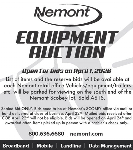 EQUIPMENT AUCTION Open for bids on April 1, 2026 List of items and the reserve bids will be available at each Nemont retail office.Vehicles/equipment/trailers etc. will be parked for viewing on the south end of the Nemont Scobey lot. Sold AS IS. Sealed Bid ONLY. Bids need to be at Nemont’s SCOBEY office via mail or hand delivered at close of business April 22nd. Mailed bids received after COB April 22nd will not be eligible. Bids will be opened on April 24th and awarded after. Items picked up in person with a cashier’s check only. 800.636.6680 | nemont.com Broadband | Mobile | Landline | Data Management EQUIPMENT AUCTION Open for bids on April 1, 2026 List of items and the reserve bids will be available at each Nemont retail office.Vehicles/equipment/trailers etc. will be parked for viewing on the south end of the Nemont Scobey lot. Sold AS IS. Sealed Bid ONLY. Bids need to be at Nemont’s SCOBEY office via mail or hand delivered at close of business April 22nd. Mailed bids received after COB April 22nd will not be eligible. Bids will be opened on April 24th and awarded after. Items picked up in person with a cashier’s check only. 800.636.6680 | nemont.com Broadband | Mobile | Landline | Data Management