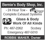Bernie's Body Shop, Inc. - 24 Hour Tow Complete Exhaust Systems Glass & Body Work Of All Kinds Ph: 487-2262 Scobey Emergency 487-5010 ROBBIE MAHER, Owner