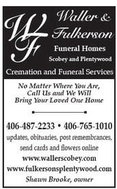 Waller & Fulkerson Funeral Homes Scobey and Plentywood Cremation and Funeral Services No Matter Where You Are, Call Us and We Will Bring Your Loved One Home 406-487-2233 • 406-765-1010 updates, obituaries, post remembrances, send cards and flowers online www.wallerscobey.com www.fulkersonsplentywood.com Shawn Brooke, owner Waller & Fulkerson Funeral Homes Scobey and Plentywood Cremation and Funeral Services No Matter Where You Are, Call Us and We Will Bring Your Loved One Home 406-487-2233 • 406-765-1010 updates, obituaries, post remembrances, send cards and flowers online www.wallerscobey.com www.fulkersonsplentywood.com Shawn Brooke, owner