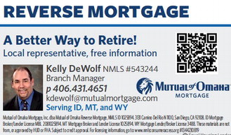 REVERSE MORTGAGE A Better Way to Retire! Local representative, free information Kelly DeWolf NMLS #543244 Branch Manager p 406.431.4651 kdewolf@mutualmortgage.com Serving ID, MT, and WY Mutual of Omaha Mortgage, Inc. dba Mutual of Omaha Reverse Mortgage, NMLS ID 1025894. 3131 Camino Del Rio N 1100, San Diego, CA 92108. ID Mortgage Broker/Lender License MBL 2081025894. MT Mortgage Broker and Lender License 1025894. WY Mortgage Lender/Broker License 3488. These materials are not from, or approved by HUD or FHA. Subject to cred t approval. For licensing information, go to: www.nmlsconsumeraccess.org #1344230819 REVERSE MORTGAGE A Better Way to Retire! Local representative, free information Kelly DeWolf NMLS #543244 Branch Manager p 406.431.4651 kdewolf@mutualmortgage.com Serving ID, MT, and WY Mutual of Omaha Mortgage, Inc. dba Mutual of Omaha Reverse Mortgage, NMLS ID 1025894. 3131 Camino Del Rio N 1100, San Diego, CA 92108. ID Mortgage Broker/Lender License MBL 2081025894. MT Mortgage Broker and Lender License 1025894. WY Mortgage Lender/Broker License 3488. These materials are not from, or approved by HUD or FHA. Subject to cred t approval. For licensing information, go to: www.nmlsconsumeraccess.org #1344230819