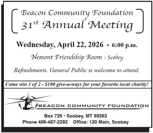 Beacon Community Foundation 31st Annual Meeting Wednesday, April 22, 2026 • 6:00 p.m. Nemont Friendship Room - Scobey Refreshments. General Public is welcome to attend. Come win 1 of 2 - $100 give-a-ways for your favorite local charity! Box 726 • Scobey, MT 59263 Phone 406-487-2292 Office: 120 Main, Scobey Beacon Community Foundation 31st Annual Meeting Wednesday, April 22, 2026 • 6:00 p.m. Nemont Friendship Room - Scobey Refreshments. General Public is welcome to attend. Come win 1 of 2 - $100 give-a-ways for your favorite local charity! Box 726 • Scobey, MT 59263 Phone 406-487-2292 Office: 120 Main, Scobey