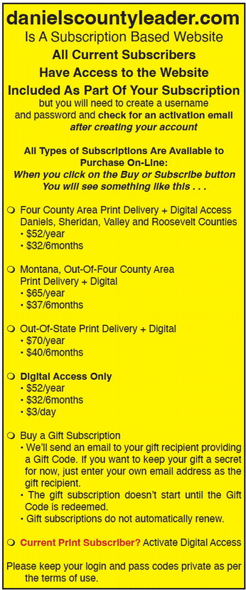 danielscountyleader.com Is A Subscription Based Website All Current Subscribers Have Access to the Website Included As Part Of Your Subscription but you will need to create a username and password and check for an activation email after creating your account All Types of Subscriptions Are Available to Purchase On-Line: When you click on the Buy or Subscribe button You will see something like this . . . Four County Area Print Delivery + Digital Access Daniels, Sheridan, Valley and Roosevelt Counties • $52/year • $32/6months Montana, Out-Of-Four County Area Print Delivery + Digital • $65/year • $37/6months Out-Of-State Print Delivery + Digital • $70/year • $40/6months Digital Access Only • $52/year • $32/6months • $3/day Buy a Gift Subscription • We’ll send an email to your gift recipient providing a Gift Code. If you want to keep your gift a secret for now, just enter your own email address as the gift recipient. • The gift subscription doesn’t start until the Gift Code is redeemed. • Gift subscriptions do not automatically renew. Current Print Subscriber? Activate Digital Access Please keep your login and pass codes private as per the terms of use. danielscountyleader.com Is A Subscription Based Website All Current Subscribers Have Access to the Website Included As Part Of Your Subscription but you will need to create a username and password and check for an activation email after creating your account All Types of Subscriptions Are Available to Purchase On-Line: When you click on the Buy or Subscribe button You will see something like this . . . Four County Area Print Delivery + Digital Access Daniels, Sheridan, Valley and Roosevelt Counties • $52/year • $32/6months Montana, Out-Of-Four County Area Print Delivery + Digital • $65/year • $37/6months Out-Of-State Print Delivery + Digital • $70/year • $40/6months Digital Access Only • $52/year • $32/6months • $3/day Buy a Gift Subscription • We’ll send an email to your gift recipient providing a Gift Code. If you want to keep your gift a secret for now, just enter your own email address as the gift recipient. • The gift subscription doesn’t start until the Gift Code is redeemed. • Gift subscriptions do not automatically renew. Current Print Subscriber? Activate Digital Access Please keep your login and pass codes private as per the terms of use.