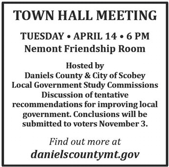 TOWN HALL MEETING TUESDAY • APRIL 14 • 6 PM Nemont Friendship Room Hosted by Daniels County & City of Scobey Local Government Study Commissions Discussion of tentative recommendations for improving local government. Conclusions will be submitted to voters November 3. Find out more at danielscountymt.gov TOWN HALL MEETING TUESDAY • APRIL 14 • 6 PM Nemont Friendship Room Hosted by Daniels County & City of Scobey Local Government Study Commissions Discussion of tentative recommendations for improving local government. Conclusions will be submitted to voters November 3. Find out more at danielscountymt.gov