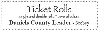 Ticket Rolls single and double rolls ~ several colors Daniels County Leader - Scobey Ticket Rolls single and double rolls ~ several colors Daniels County Leader - Scobey